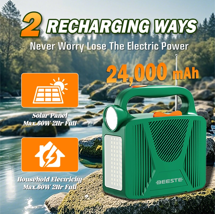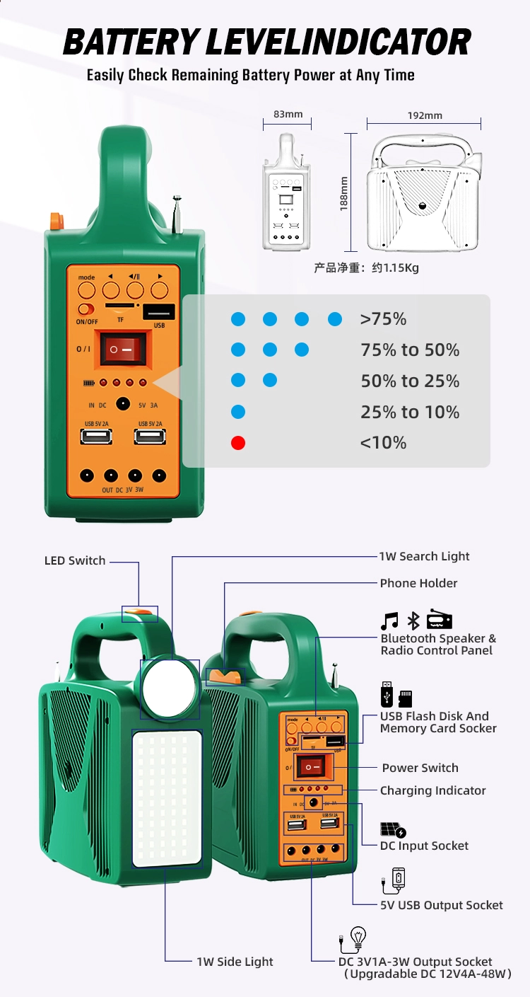 BESSTE D80M has 6output ports for seamless power distribution: 2×USB (compatible with phones, tablets, and more), 4×DC (Suitable for LED bulbs or DC electric fans.), and USB Flash Disk & Memory Card Socker.And has FM function.Whether outdoors or in emergencies, keep multiple devices powered simultaneously with ease.